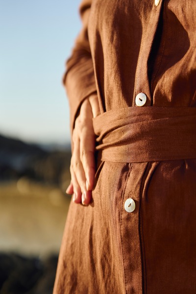 Maxi linen dress with a timeless shirt style that adds a touch of understated elegance. Wear dress relaxed or tighten around waist with matching belt.